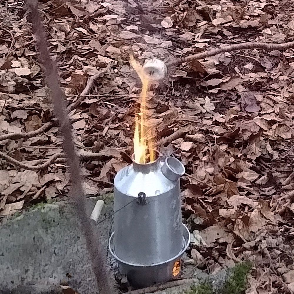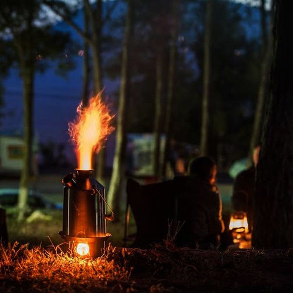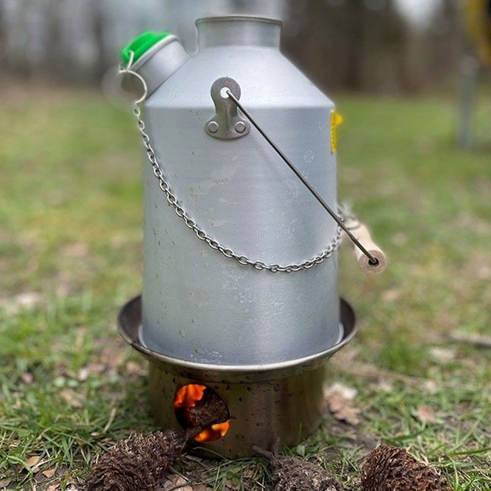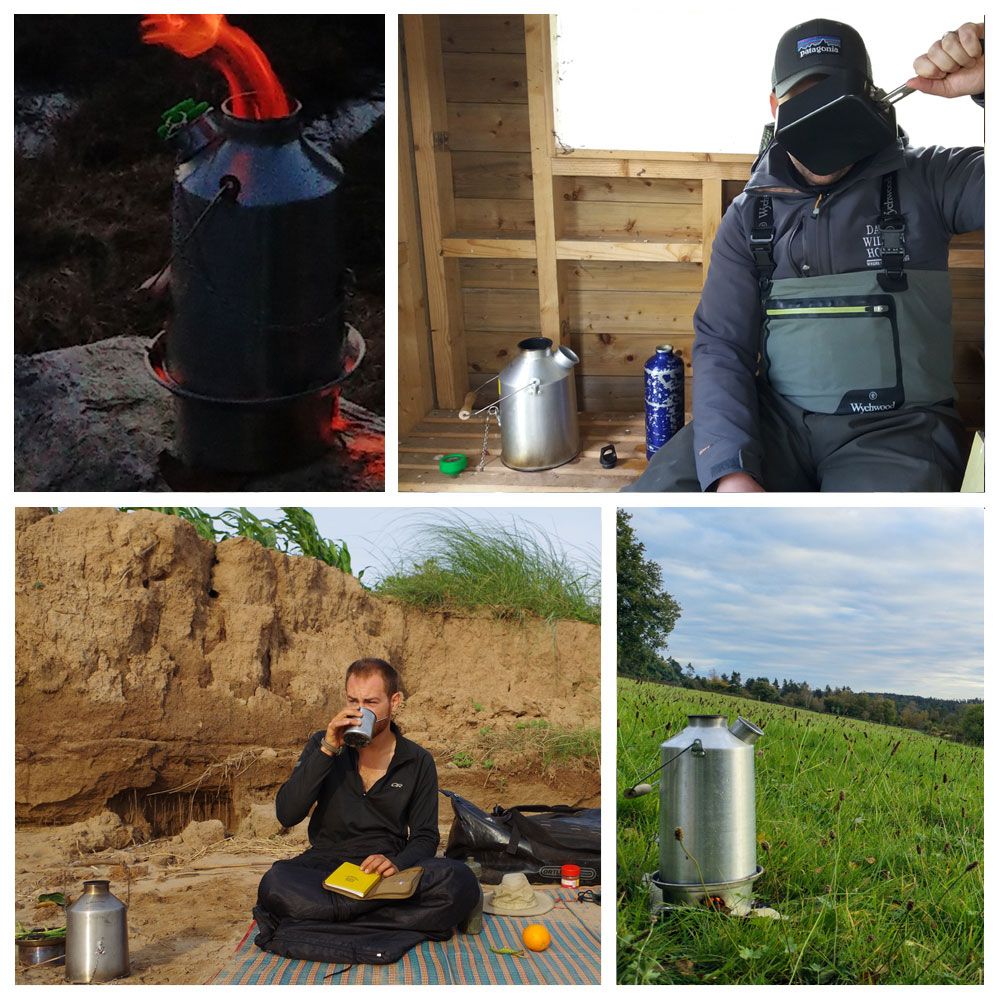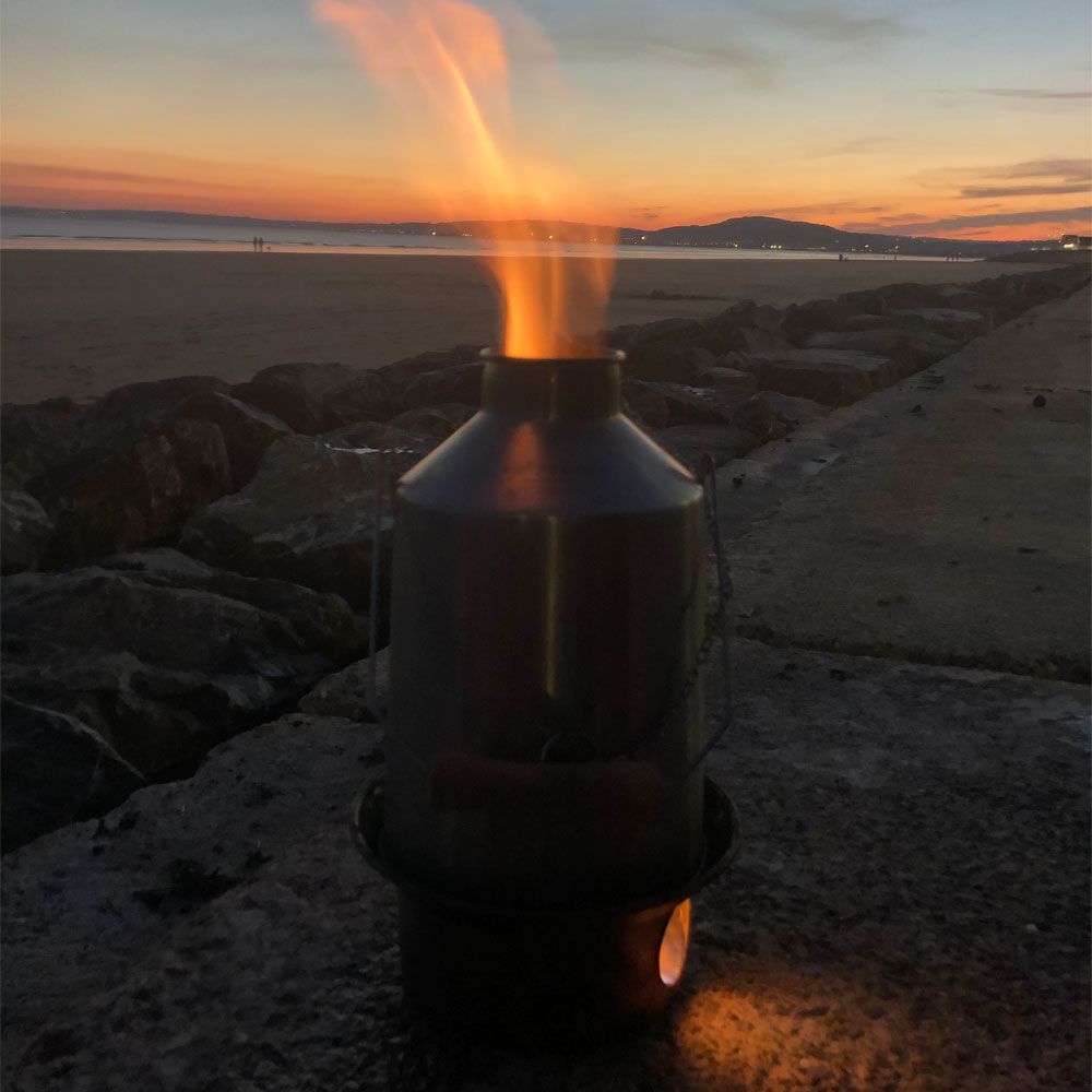 The Kelly Kettle is a superb piece of camping equipment that even works in storm conditions bringing water to the boil within a matter of minutes using whatever solid fuel is naturally occuring in the area - sticks, grass, pine cones, birch bark etc.